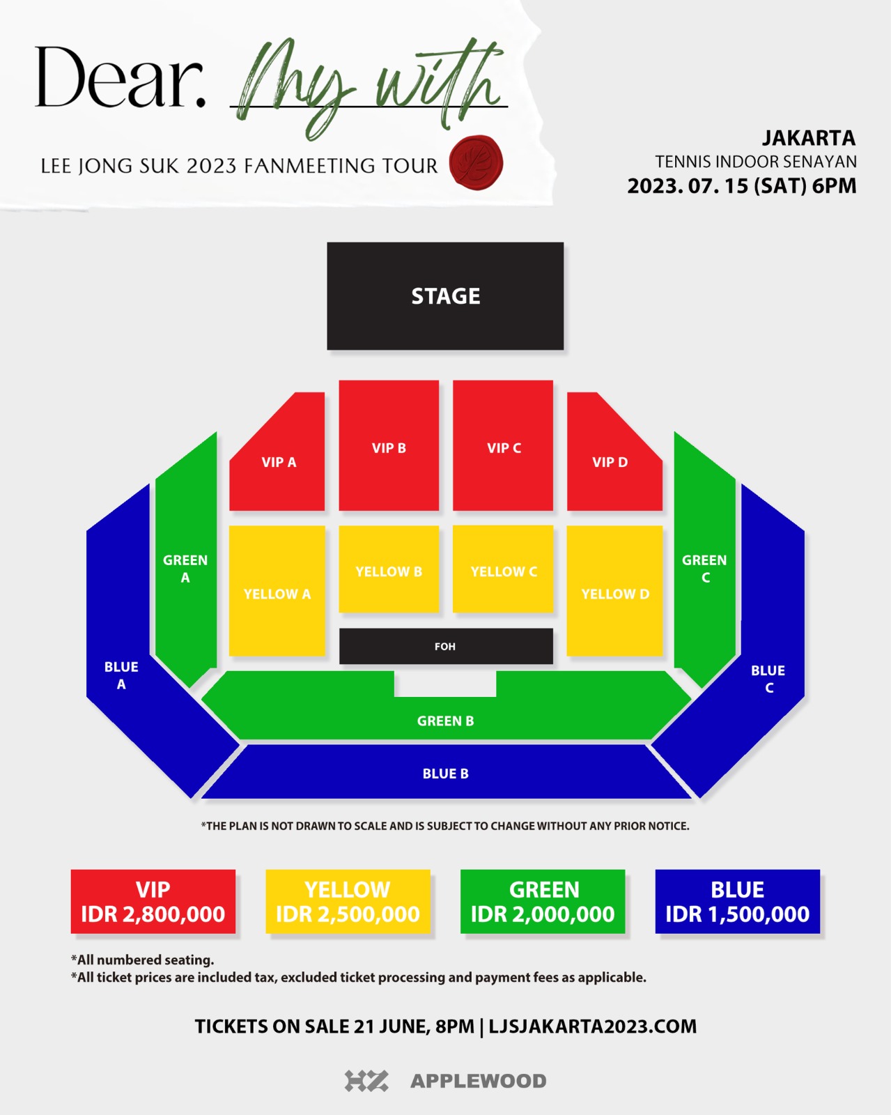 - Tickets (E-Tickets and Physical Tickets) can only be purchased through ljsjakarta2023.com and valid to enter the LEE JONG SUK 2023 FANMEETING TOUR (Dear. My With) in Jakarta.